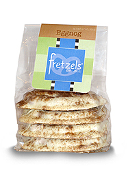 Eggnog-infused white chocolate covered pretzels dusted with real cinnamon.