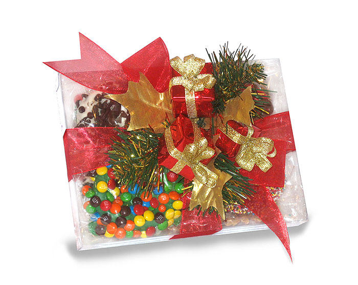 An eight-piece assortment of Christmas chocolate covered pretzels all dressed up in red and green. Each Fretzel is individually wrapped and arrives in a crystal clear gift box adorned with red sheer ribbon and festive holiday trim.